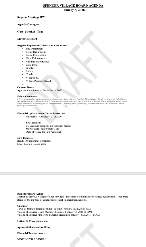 The Village of Spencer reminds all property owners that sidewalks must be cleared of snow and ice within 24 hours following a snow or ice event.