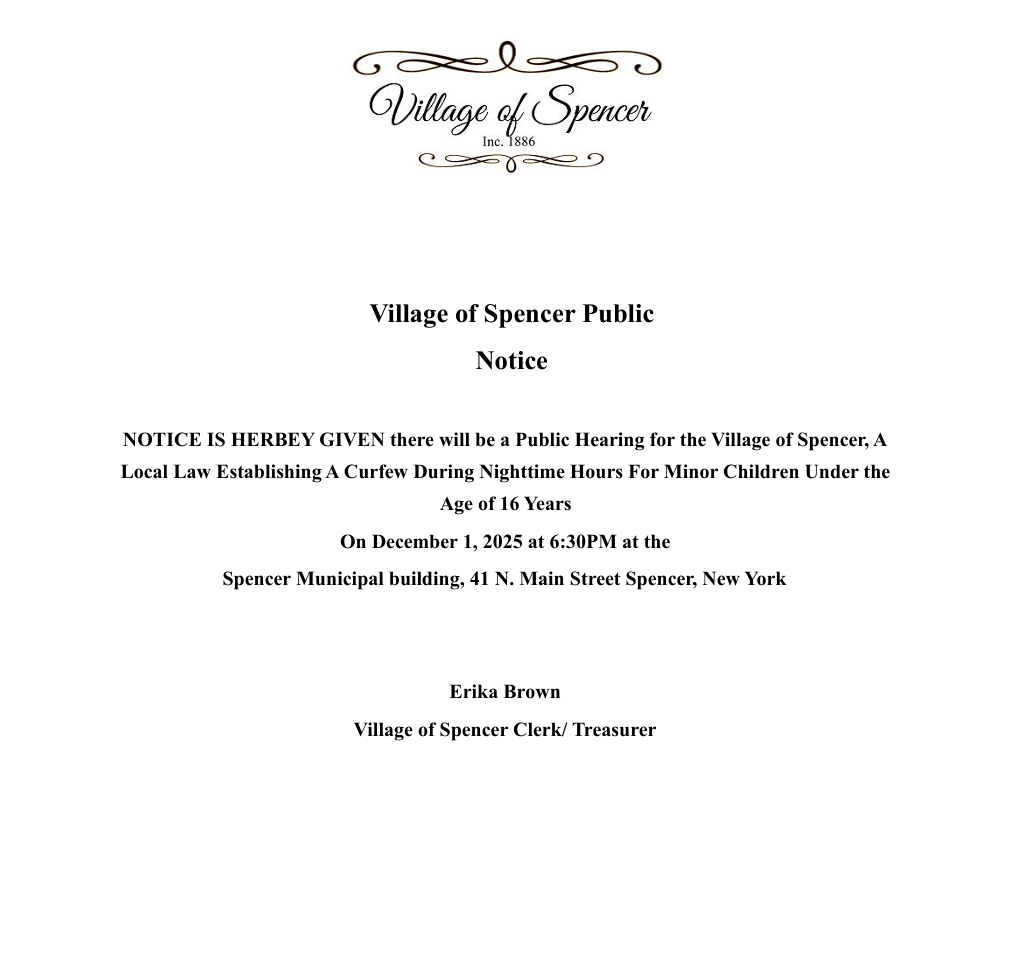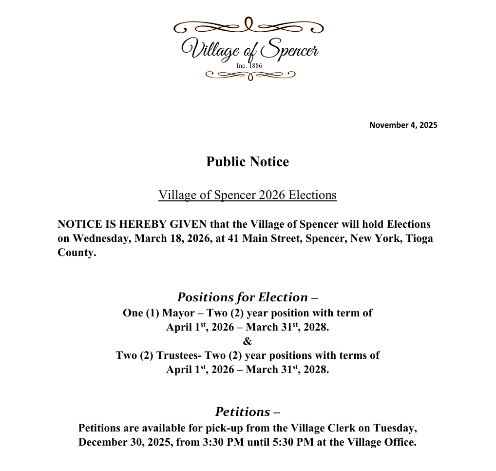 The Village of Spencer office will be closed on Thursday, November 27, 2025, to observe Thanksgiving .