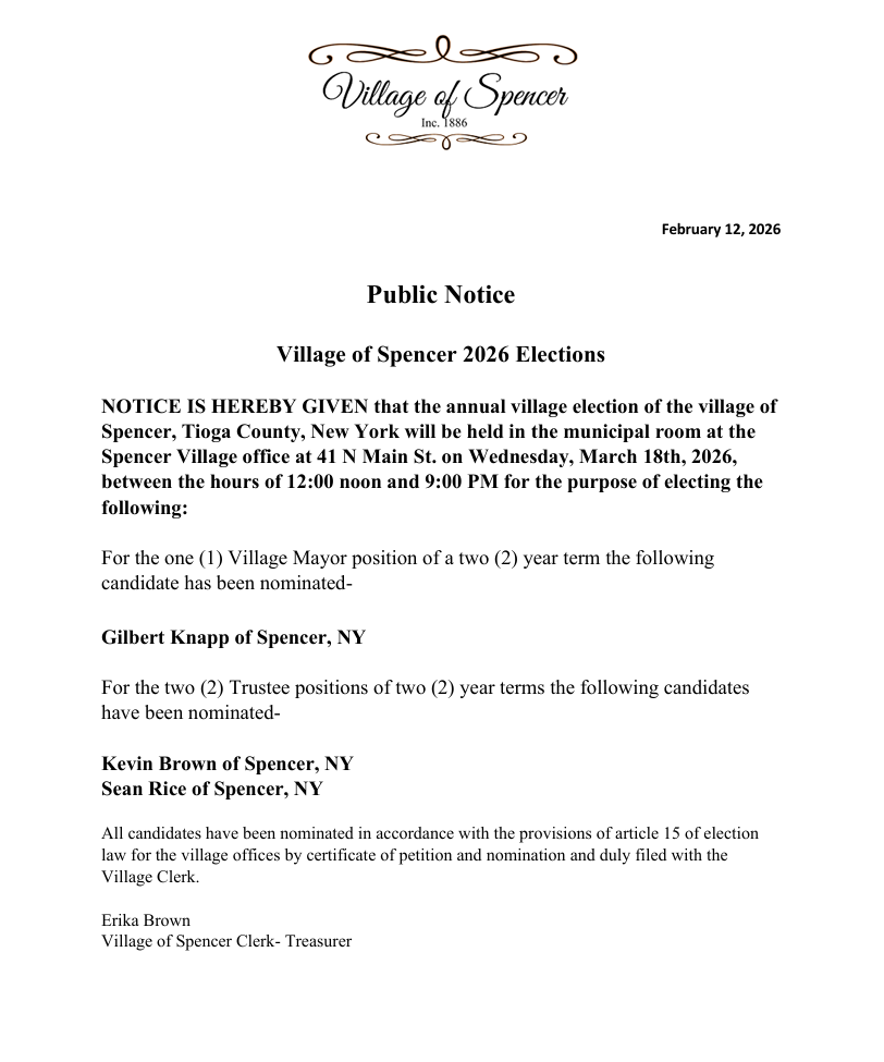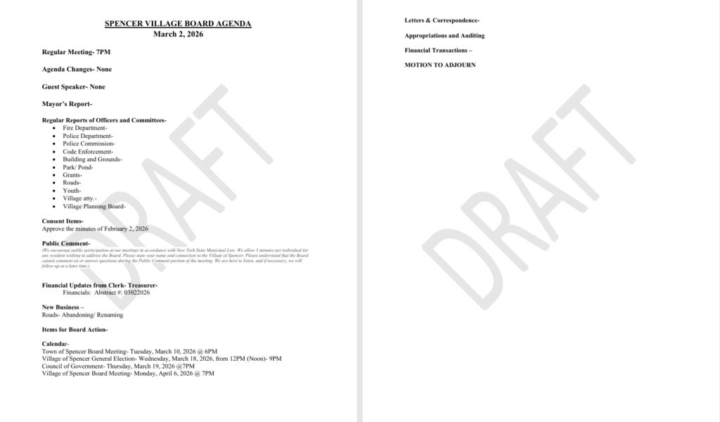 The Village of Spencer Planning Board meeting will be held Monday, February 23, 2026, at 7PM located at 41 N. Main Street Spencer, NY.
