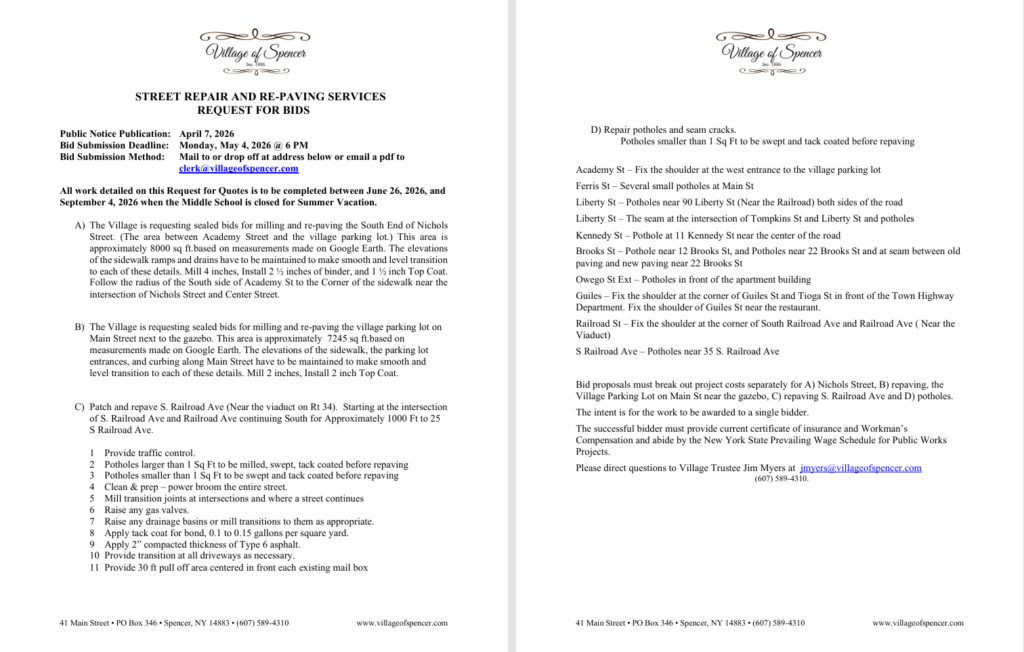 Village of Spencer Board Meeting will be held in the Village Municipal Hall on Monday, May 4, 2026, at 7:00 PM.